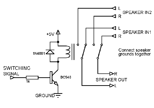 Now it's only needed to connect the circuit with 3 wires, test it (if you switch computers you should hear the relay!) and solder proper sound cables to apropriate relay pins. You may use sockets for it, but I had no space on the rear to put them, so I used 3 cables with 3.5mm jack connectors (2 male, 1 female - for speakers). Finally remember to connect speaker's grounds together.