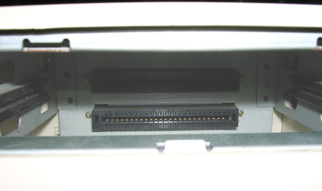 2 Joystick connectors (covered with plate), printer port, volume